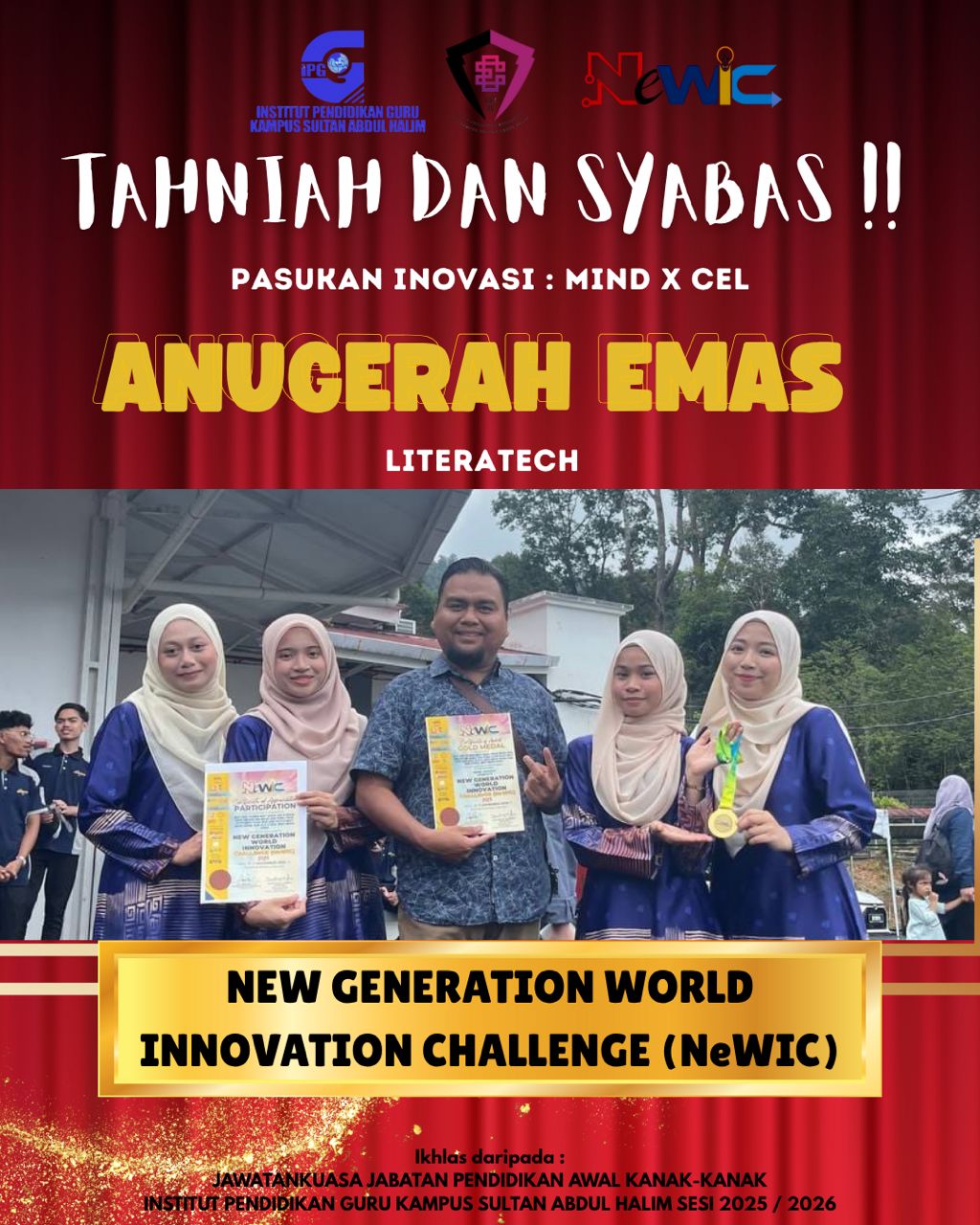 Tahniah dan syabas diucapkan kepada semua siswa dan siswi Pendidik Jabatan Pendidikan Awal Kanak-kanak ambilan 2021/2026 atas kejayaan meraih Anugerah Emas dalam Pertandingan NewGen World Innovation Challenge (NeWIC) yang telah berlangsung di Dewan Budi Gemilang, Kolej KEDA.